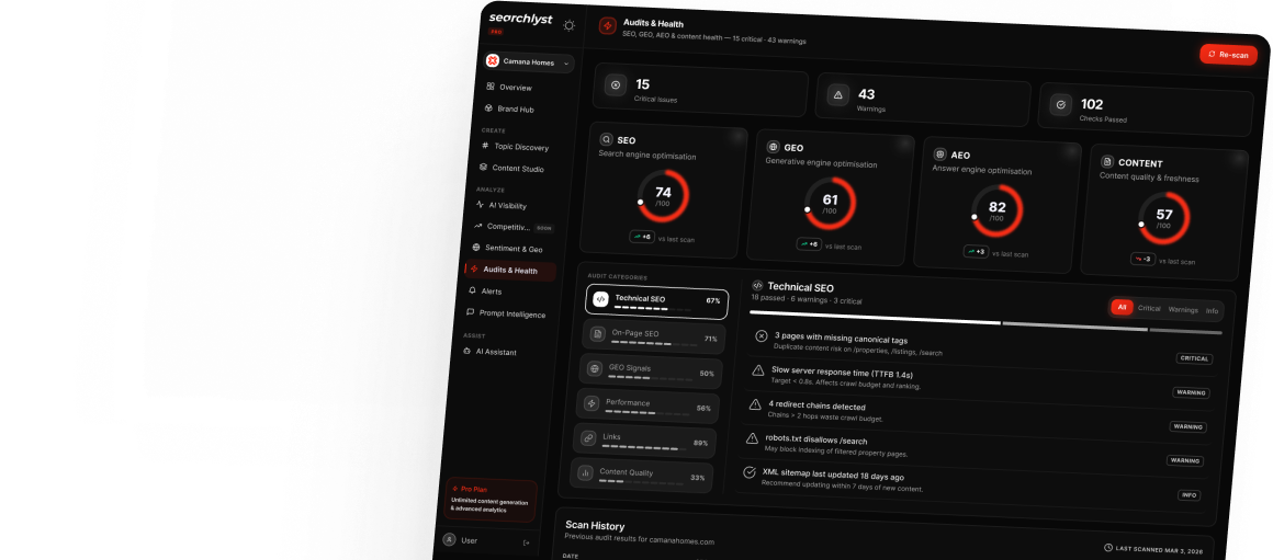 Run SEO, GEO, AEO, and content quality audits to identify critical issues, warnings, and optimization opportunities that affect your AI visibility.