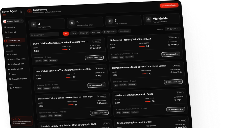 Discover what's trending in your industry, matched to your brand. Each topic comes with reach estimates, trend scores, and AI potential ratings to guide your content strategy.