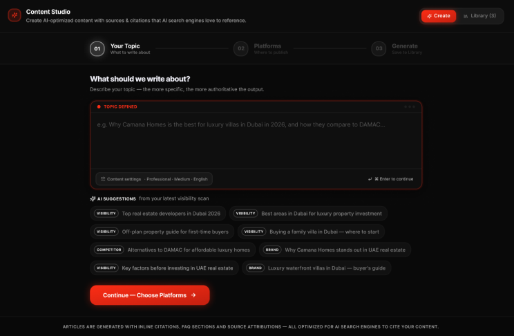 Generate AI-optimized articles with inline citations, FAQ sections, and source attributions — all designed to make AI search engines reference your content.