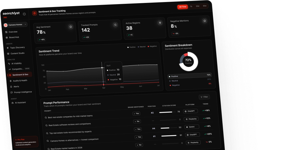 Track sentiment trends, regional performance, and prompt-level analytics to understand exactly how AI platforms talk about your brand across the globe.